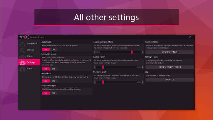 Dragonrise Games YoloX, Oyunlarda bulunan artı nişan işaretlerini değiştirmek istiyorsanız YoloX ile mümkündür. Daha önce hiç görülmemşiş olan ses sensörü, hileye karşı güvenlik sensörü, hareket sensörü ve tersine çevrilmiş olan renkleri gibi özellikler taşır. Ayrıca ses kaçırmadan kendi müziklerinizi dinleyebilir, özel ve tam ekran modunda çalıştırabilir, FPS düşüklüğü yaşamadan Gamebar gibi başka uygulama eklentilerine gerek kalmadan yapabilirsiniz.