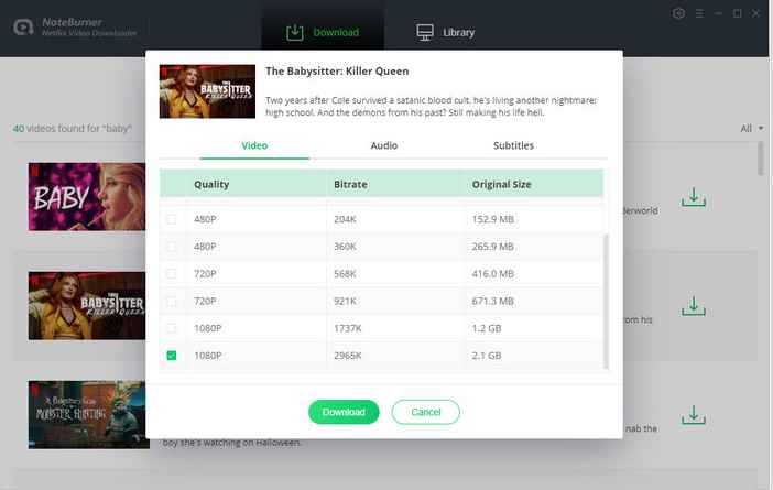 Netflix dizi ve de filmlerini şimdi MP4 veya yüksek kalitede HD bir şekilde indirecek ve indirme esnasında hiç bir kalite kaybı olmaz. 4K VB HD ses, HD görüntü kalitesi destekler ve hızlı bir şekilde indirmenizi sağlar. İndirmek istediğiniz videoyu seçin ve indirmek istediğiniz kaliteye tıklayarak indirin. NoteBurner Netflix Video Downloader yazılımı ile en sevdiğiniz her içeriği altyazılı ve ya dual ssesle indirin.