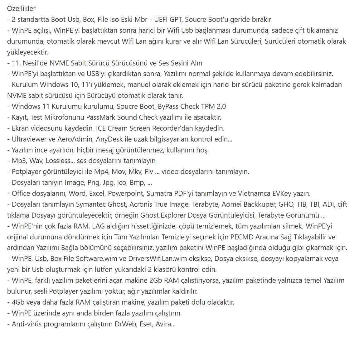 Windows sistemini + server dahil daha iyi kurmak ve onarım yapacağınız yardımcı bir yazılım dolu portable sistemdir,Windows yüklemelerinizi sadece bir kaç tıklama ile yapacak ve sorunsuz otomatik bir şekilde pc onarımı yapın. Video dosyaları tanımlama, ekran görüntüsü alma ve PDF tanımlama gibi pek çok işlem yapabilirsiniz. USB Destekli MBR GPT MBR UEFİ uyumlu, Yanınızda taşıyıp